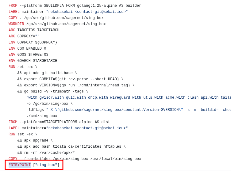 通过 sing box dockerfile 文件可以知道 ENTRYPOINT 命令是 sing-box