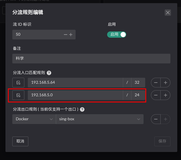 我的软路由的lan口ip为192.168.5.1,所以我设置为192.168.5.0/24用来匹配所以ip地址