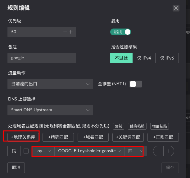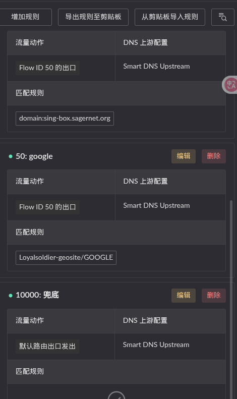 根据需要选择要代理的地址,需要注意需要创建一条兜底的DNS并出口指向默认流